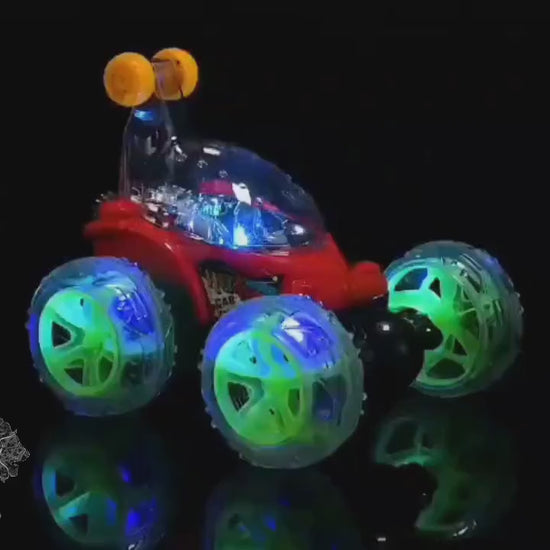 - 360° Rotating R/C Stunt Car: Double sides running, moving forward, backward, turning left, right, 360 degree tumbling flip for different playing experience on this electric remote control stunt car. You can control the RC cars for kids in any direction with its remote controller. This remote control car can race, and, perform double-sided driving, 360° spins and flip with its LED dazzling headlights